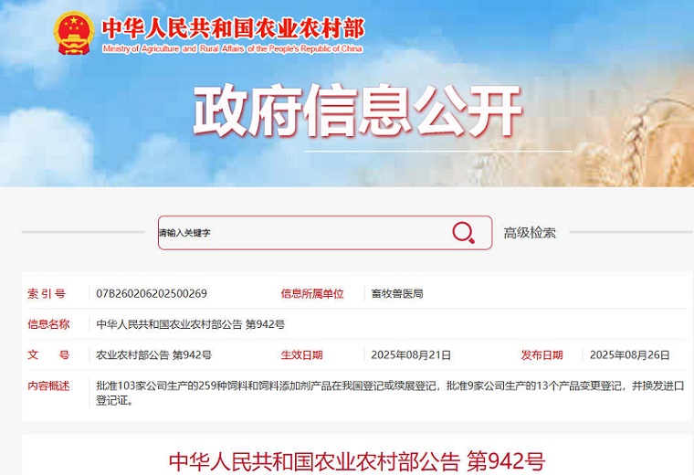 • 農業農村部批準103家境外公司生產的259種飼料和飼料添加劑產品在我國登記或續展登記 查看詳情>